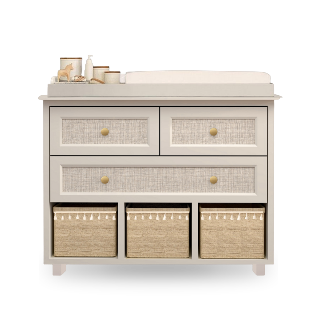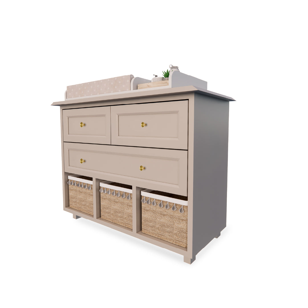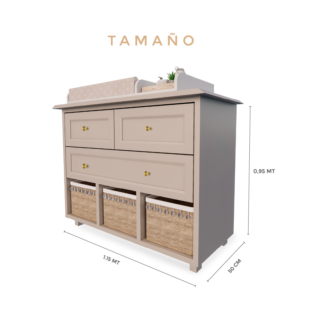 Cambiador Ame está diseñado para fomentar la independencia de tu hijo en su rutina diaria, Equipado con tres cajones de diferentes tamaños y alturas, junto con tres canastos en la parte inferior, ofrece un espacio organizado y accesible para guardar la ropa y objetos esenciales de tu hijo. Fabricado en madera Flor morado que no solo añade un toque estético encantador, sino que también garantiza una larga durabilidad , asegurando una vida útil prolongada para el mueble. Al elegir el cambiador Ame, estás invirtiendo en más que un simple mueble práctico; estás creando un ambiente acogedor y organizado en la habitación de tu hijo.