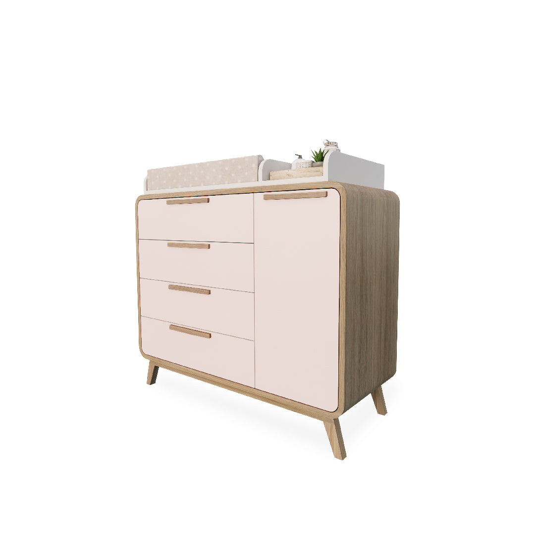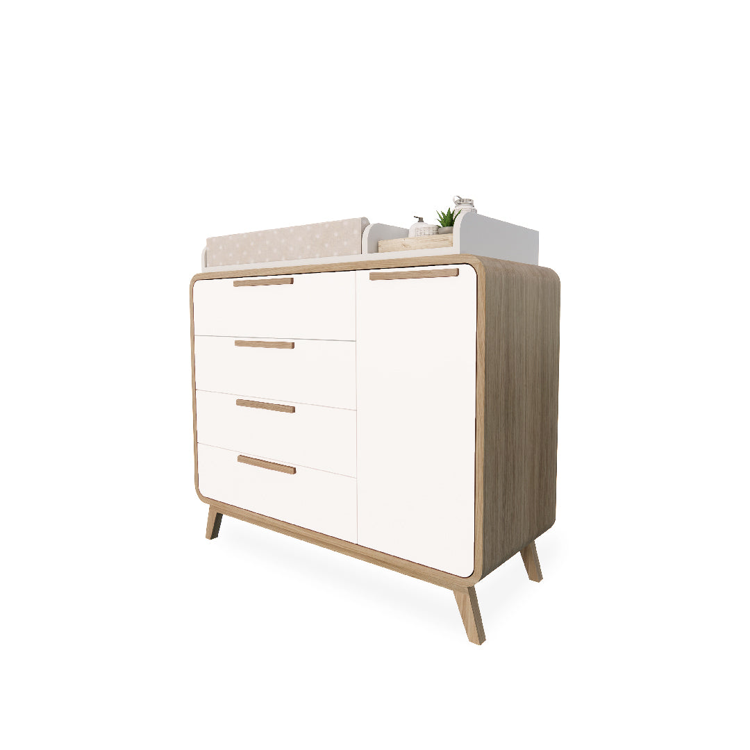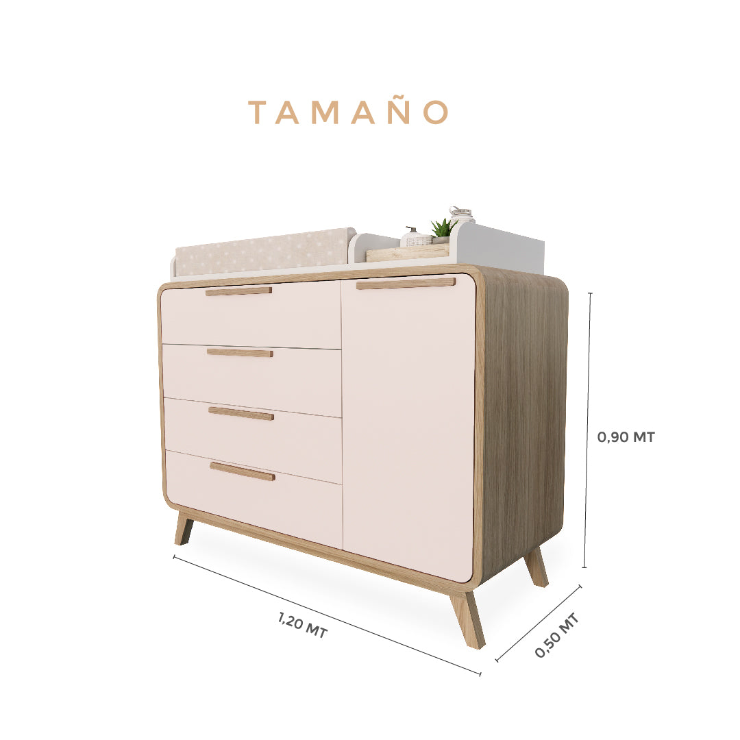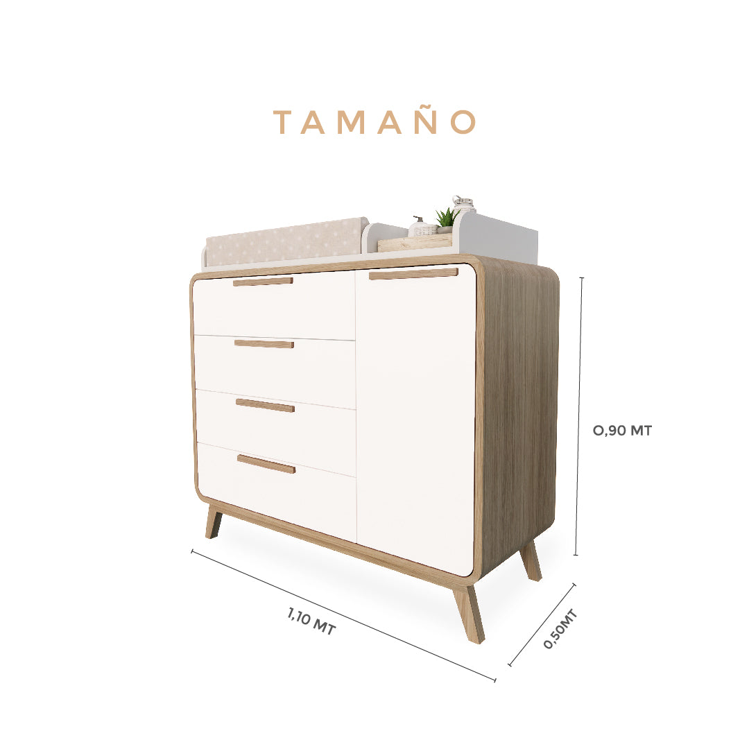 Cambiador Ref LIni es una solución versátil diseñada para un almacenaje práctico y sencillo, Su diseño innovador incluye cuatro cajoneras de diferentes alturas, proporcionando espacio para organizar prendas y accesorios de manera eficiente. Además, cuenta con un amplio espacio con puerta abatible, permitiendo que tus pequeños cuelguen sus prendas de forma autónoma.